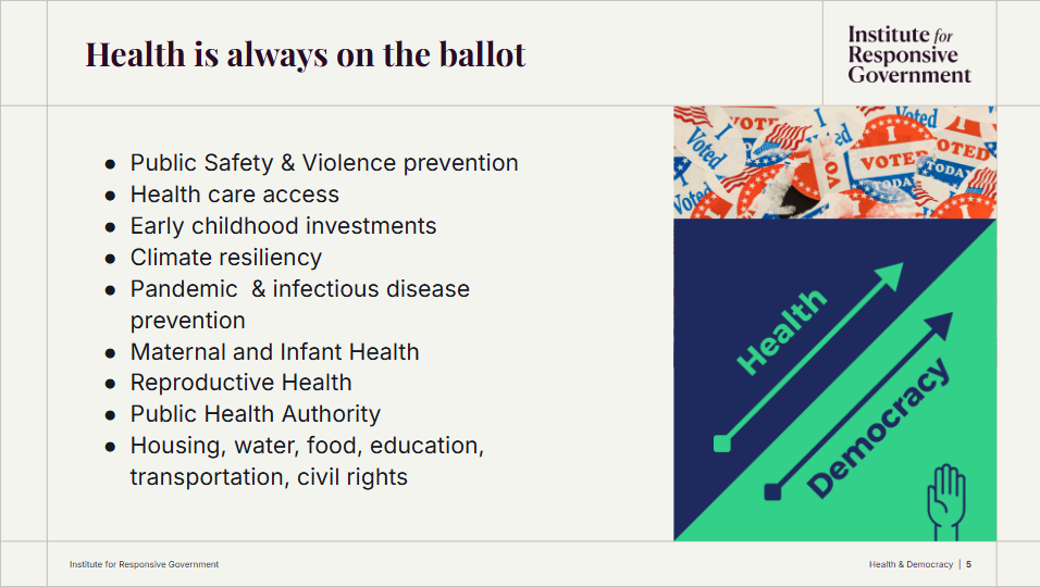 Our conversation highlighted research showing that public health and democracy are deeply interconnected: both rely on participation, trust, and collective care. Gnora shared a striking statistic—healthcare workers make up the largest workforce in the U.S., accounting for nearly 22 million people (about 14% of all workers). As trusted messengers in their communities and with policymakers, it’s essential that health professionals also make their voices heard at the ballot box.